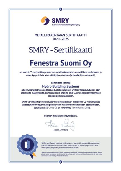 SMRY -Sertifikaatti osoittaa, että yritys on saanut CE-merkintään perustuvan metallirakennealan ammatillisen koulutuksen ja omaa kyvyn toimia alan määräysten, ohjeiden ja standardien mukaisesti.